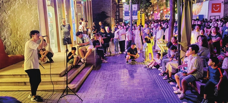 8月12日晚,钟楼街人头攒动分外热闹,一眼看去满满的烟火气。“这位大哥已经准备很长时间,让他为咱们献上一曲。”“大哥,别紧张,对着手机屏幕唱就好!”一家商店旁的空地上,一口“播音腔”的男主播话筒递到一名路人手中,不停地鼓励对方。路人鼓起勇气,神情紧张地对着支架上正在直播的手机开始唱歌。歌声嘹亮,引来不少路人围观。继续往前二三十米,同样有一名男主播在和路人互动。这些主播的出现,让钟楼街的气氛更加活跃,为美丽夜色增添了一抹亮色。