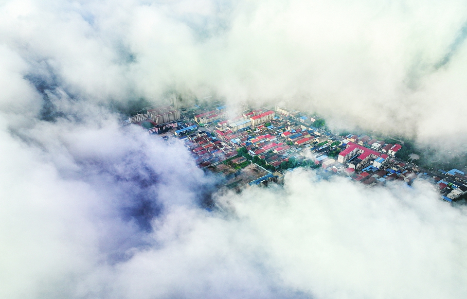 8月21日,临汾市翼城县出现平流雾景观,该县城区笼罩在云雾中若隐若现,宛如仙境。(记者 刘江 通讯员 胡波)