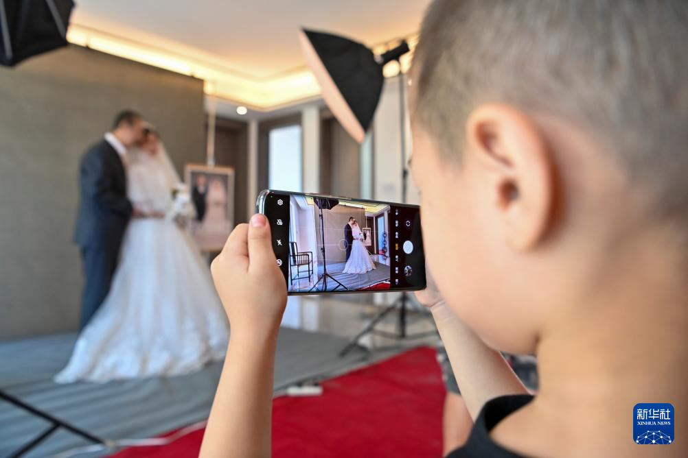 8月22日,小朋友用手机记录爷爷奶奶的婚纱照拍摄过程。