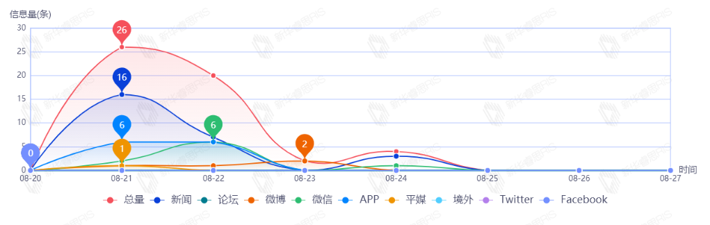 截至目前,该文章在互联网上传播总量52篇。其中8月21日是传播的高峰期,共传播26篇文章。各信源的信息发布情况中,新闻信息占比最大,其次是APP和微信,占比分别为50.00%、23.08%、17.31%。(数据来源:新华睿思数据云图分析平台)