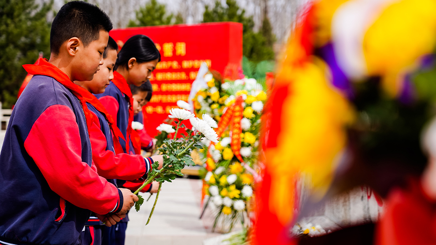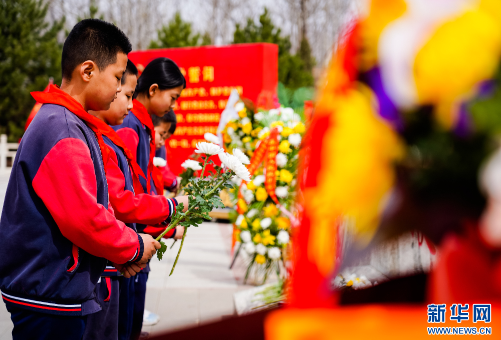 在平型关大捷纪念馆,学生为革命英烈敬献鲜花。新华网 发