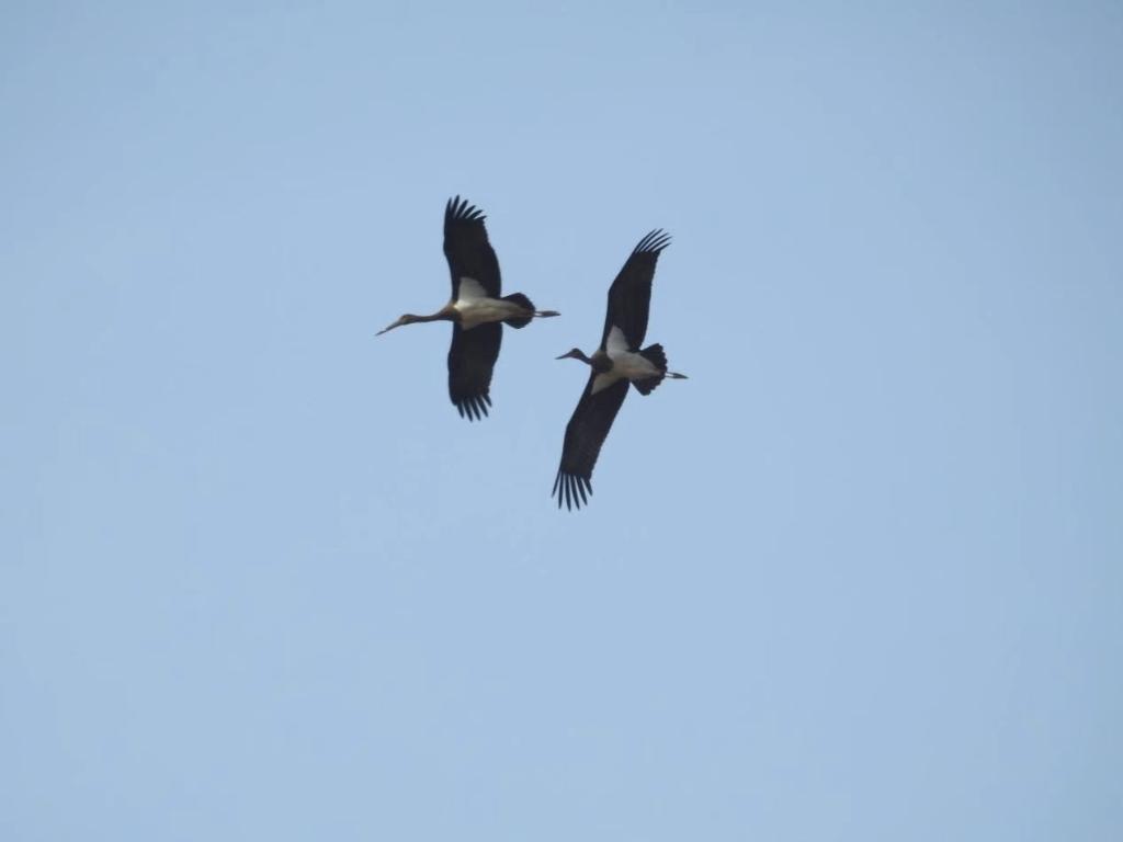 这群灵动的身影,勾勒出人与自然和谐共生的美丽画卷。黑鹳是一种大型涉禽,偏好栖息于水质澄澈、食物丰富的开阔河岸、沼泽湿地及溪流周边。由于全球数量稀少,黑鹳被誉为“鸟中大熊猫”。