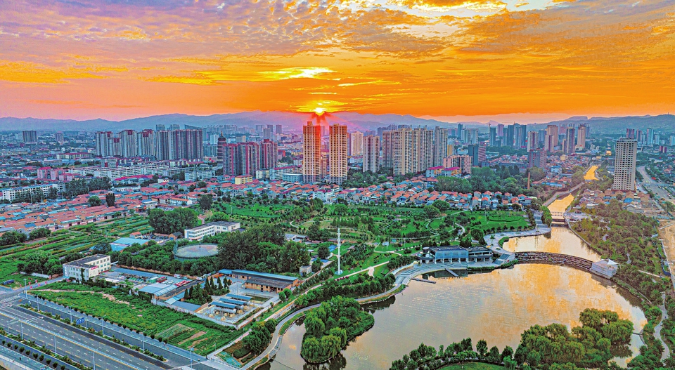 8月20日,长治市潞州区,朝霞与城市公园、道路、民居交相辉映,美不胜收。近年来,该市通过雨污分流改造、河道清淤、生态修复等工程,恢复水体生态,并打造亲水步道、景观公园,建设橡胶坝蓄水成景,让一河秀水成为扮靓古城、造福百姓的生态纽带。