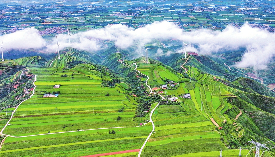 9月4日,俯瞰夏县瑶峰镇大山深处,云雾氤氲,一座座风机叶片迎风转动,层层叠叠的梯田宛如黄绿色的地毯铺展开来,民居点缀其间,构成一幅充满诗意的秋日画卷。(姚中吉摄)