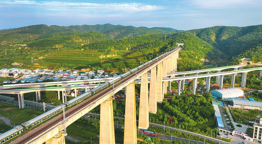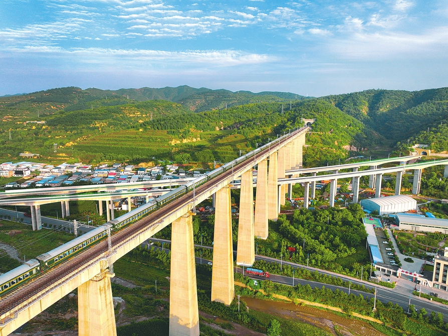 9月7日,吕梁市境内,一列客车缓缓驶过离石区车家湾特大桥。太中银铁路轨道、工业大道与高架桥在山间交织,错落有致,勾勒出一幅立体交通的壮美图景。