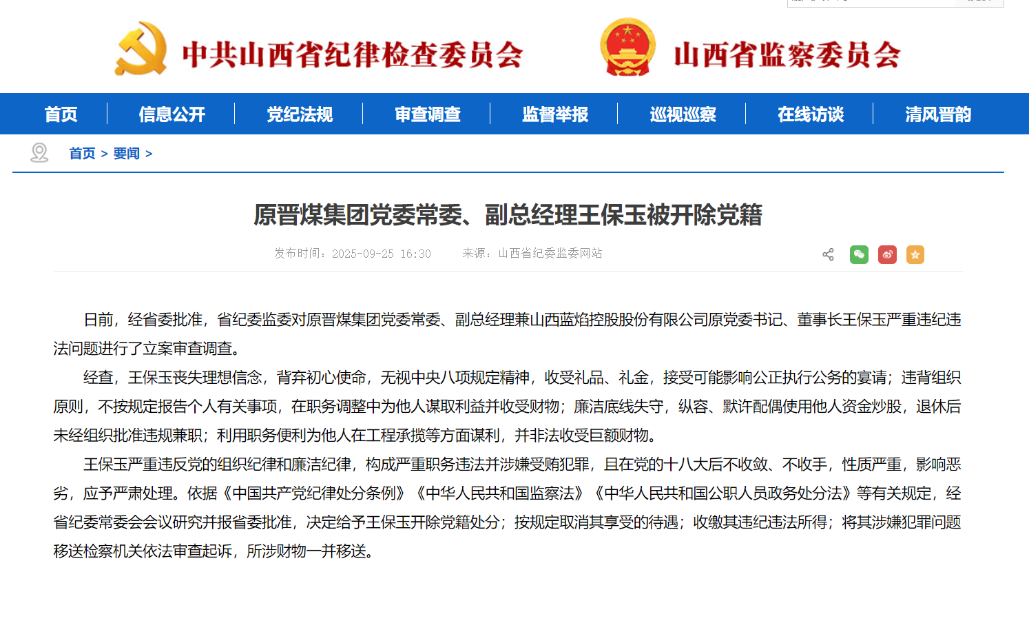 日前,经省委批准,省纪委监委对原晋煤集团党委常委、副总经理兼山西蓝焰控股股份有限公司原党委书记、董事长王保玉严重违纪违法问题进行了立案审查调查。