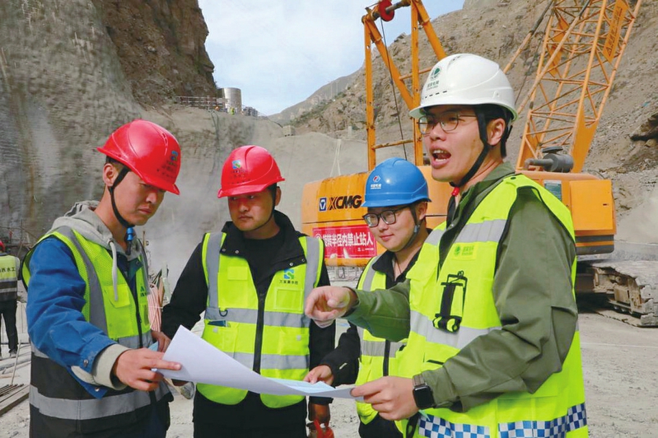 图②:国网新源山西浑源抽水蓄能电站工程部工作人员正在对拦河坝现场施工情况进行检查。(通讯员摄)