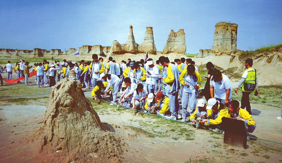 前来研学的学生们近距离观察地貌。资料图片