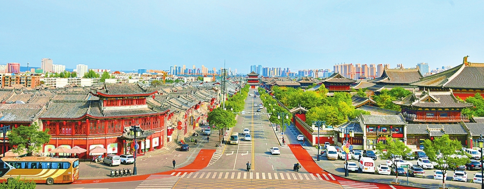 10月20日,俯瞰大同古城,古朴的楼阁错落有致,与远处的现代化建筑相互映衬,展现出这座千年古都深厚底蕴和时代活力。(记者杨晨玉摄)
