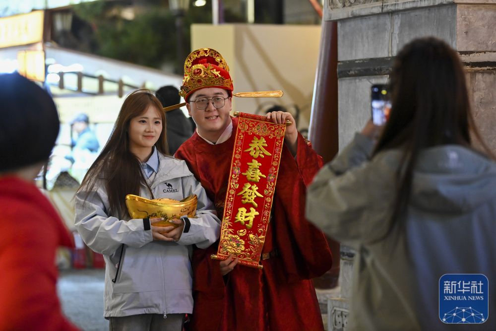 ↑ 游客和表演人员在钟楼街合影(11月1日摄)。