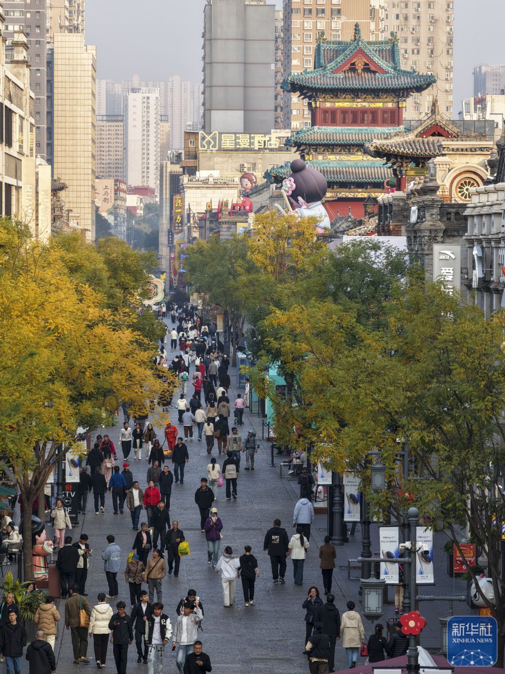 ↑ 游客在钟楼街行走(无人机照片,10月29日摄)。