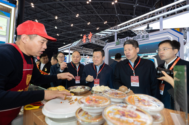 运城展厅以“七彩盐湖”为主轴,工业制造、绝技绝活、非遗文化、农业“三新”技术四大展区环抱布局。入口处,“关公大宴”系列面点、“王万保”苹果、垣曲炒粸、临猗黄河大闸蟹等运城本地美食香气交融,吸引众多参观者驻足品鉴,率先体验河东大地的物产之丰与匠心之醇。
