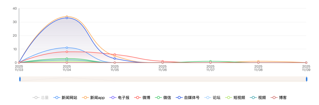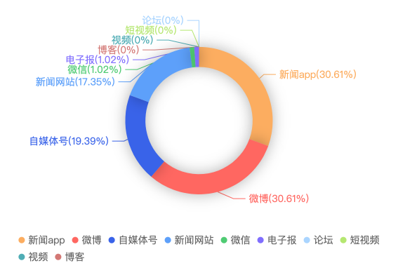 截至目前,该文章在互联网上传播总量共98篇。各信源的信息发布情况中,微博和新闻APP占比最大,其次是自媒体号。(数据来源:新华睿思·数媒智慧分析平台)