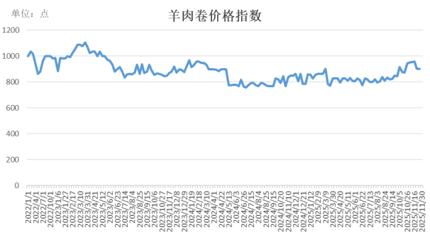 12月1日,怀仁羊肉卷价格指数报901.90点,较上期上涨0.23%,价格报52.31元/公斤,较上期上涨0.12元/公斤。