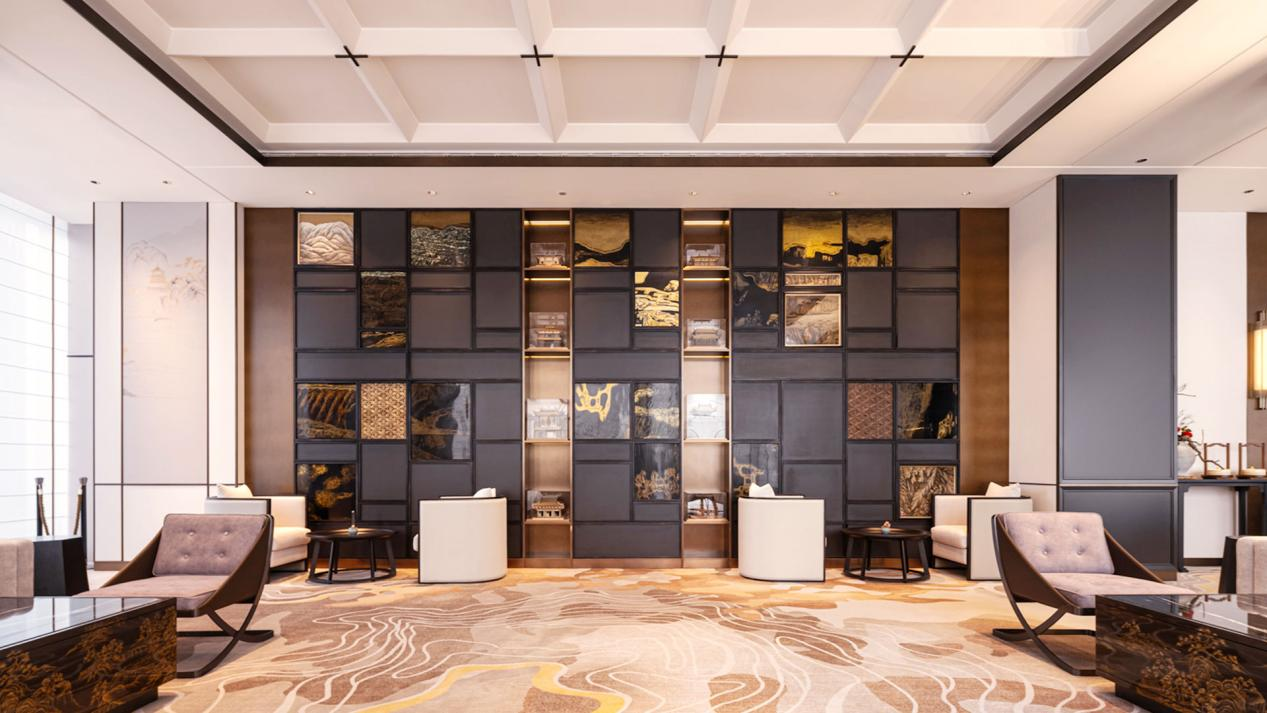 晋泽昌文旅酒店休息区北墙的《太行与吕梁印象》,以“左手一指太行山,右手一指是吕梁”呼应晋商故乡根脉,更以木雕、推光漆、堆锦、瓷板画融合的工艺,延续晋商会馆的技艺基因,将晋派建筑的材质追求化为传统与现代兼具的艺术表达,让到访者感受到晋商发源地的山河气魄与技艺传承。