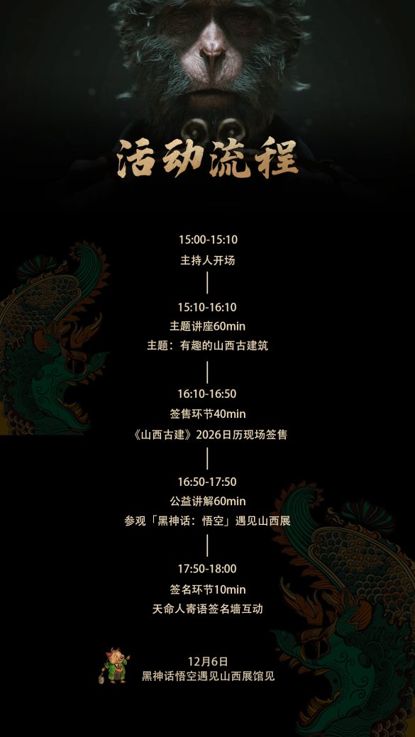 本次活动由「黑神话:悟空」遇见山西展运营方、三晋出版社·问弗文化工作室、一新研学联合主办,将通过“线上+线下”的方式进行。无法到场的观众可通过「黑神话:悟空」遇见山西展官方视频号、抖音号、小红书等平台收看直播。