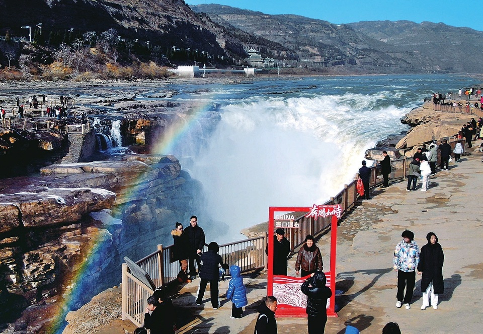 12月20日,游客在吉县黄河壶口瀑布旅游区游览拍照。为激活冬季旅游市场,该景区联动陕西黄河壶口瀑布旅游区,推出全国游客免门票优惠活动,打造“核心引流+全域消费”的冬季旅游生态圈,赋能县域经济发展。(吕桂明摄)