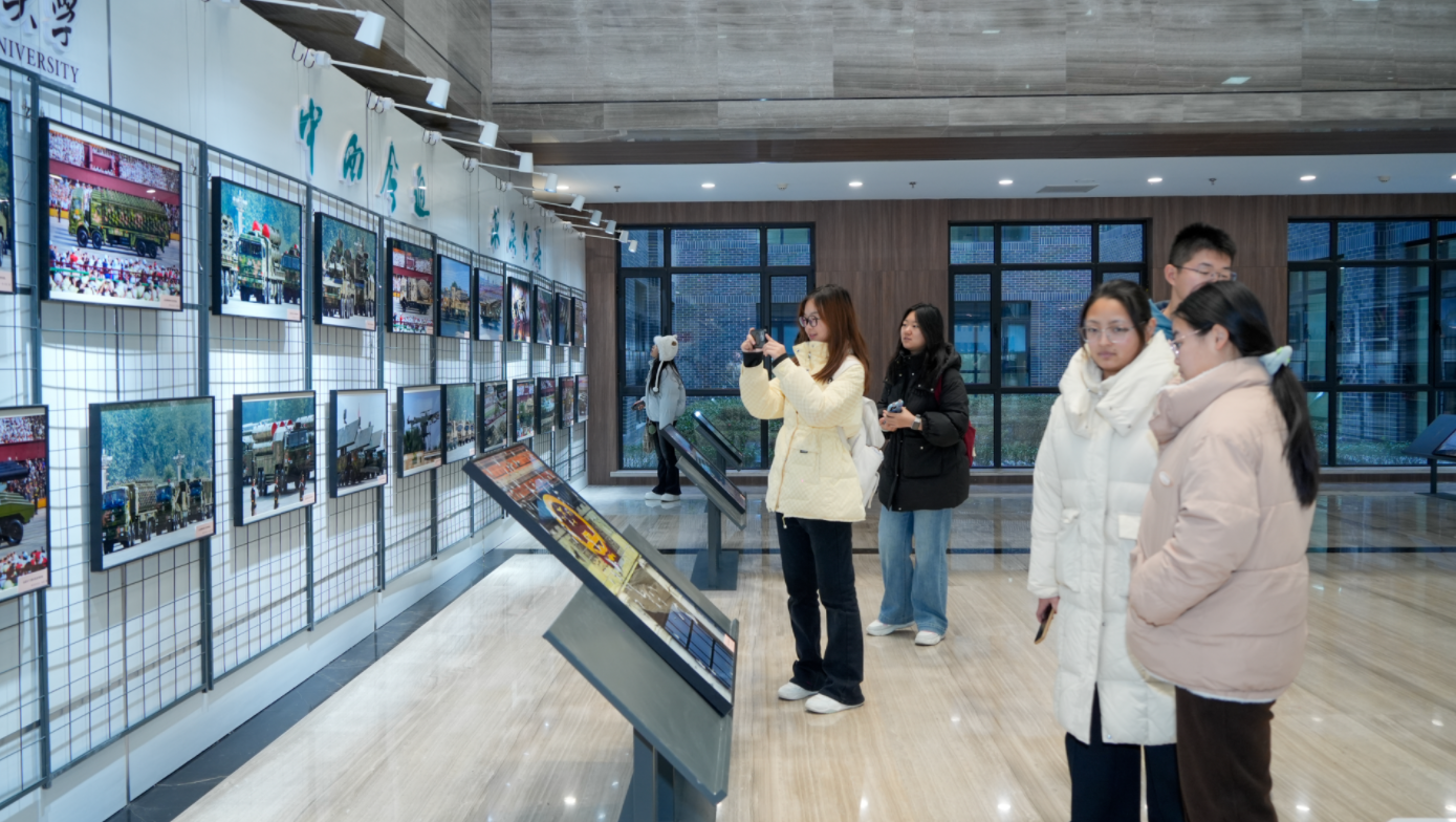 开幕式后,与会嘉宾和师生代表共同前往求真楼一楼大厅观展。大家在一幅幅展现阅兵方阵、新型武器装备等场景的经典影像前驻足观看。