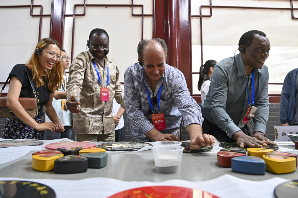 参观者在平遥古城体验推光漆器制作。新华社记者 杨晨光 摄