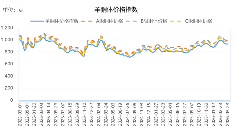3月23日,怀仁羊胴体价格指数报930.76点,较上期上涨0.23%,A级胴体价格报24.55元/斤,较上期下跌0.03元/斤,跌幅0.12%;B级胴体价格报24.76元/斤,较上期上涨0.01元/斤,涨幅0.04%;C级胴体价格报24.24元/斤,较上期上涨0.27元/斤,涨幅1.13%。