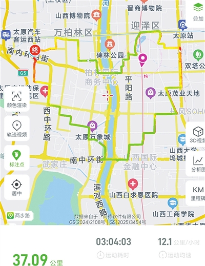 “骑行25公里,祝自己生日快乐!”3月26日,市民刘爽在微信朋友圈晒出一张骑行轨迹图,骑过的线路组成数字“31”。这是她送给自己的31岁生日礼物。三月春光暖,社交平台关于“太原骑行”的话题明显增多,大家用骑行的方式“打开春天”,也骑出了新花样。有人用骑行轨迹在城市“作画”,感受春日美好的同时,增添了一份独特的浪漫气息。