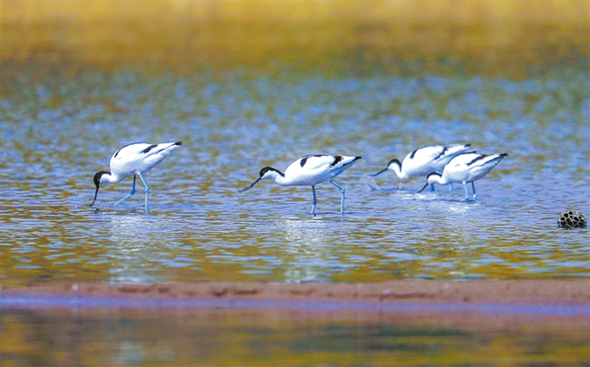 这是3月中旬拍摄的水鸟在临汾市汾河文化生态景区觅食嬉戏。新华网发(闫锐鹏 摄)