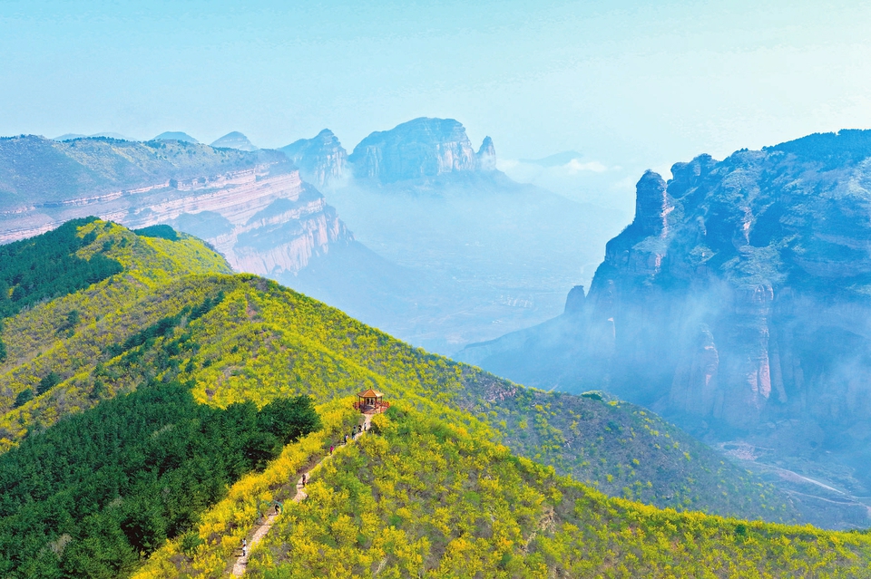 4月9日,黎城县洗耳河景区听松岭春意盎然。漫山连翘花次第绽放,缀满太行山峦,山间石板步道蜿蜒向前,远处的茶壶山云雾缭绕,层峦若隐若现,尽显太行生态美景。(张国平摄)